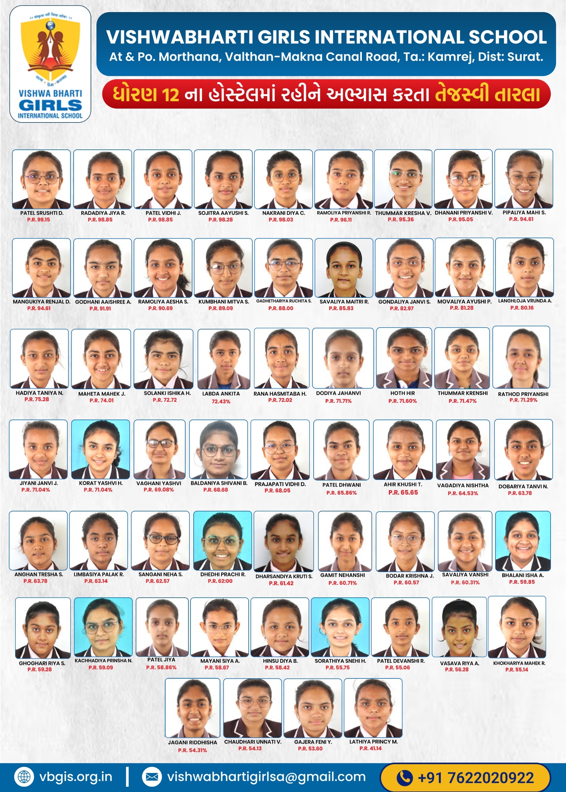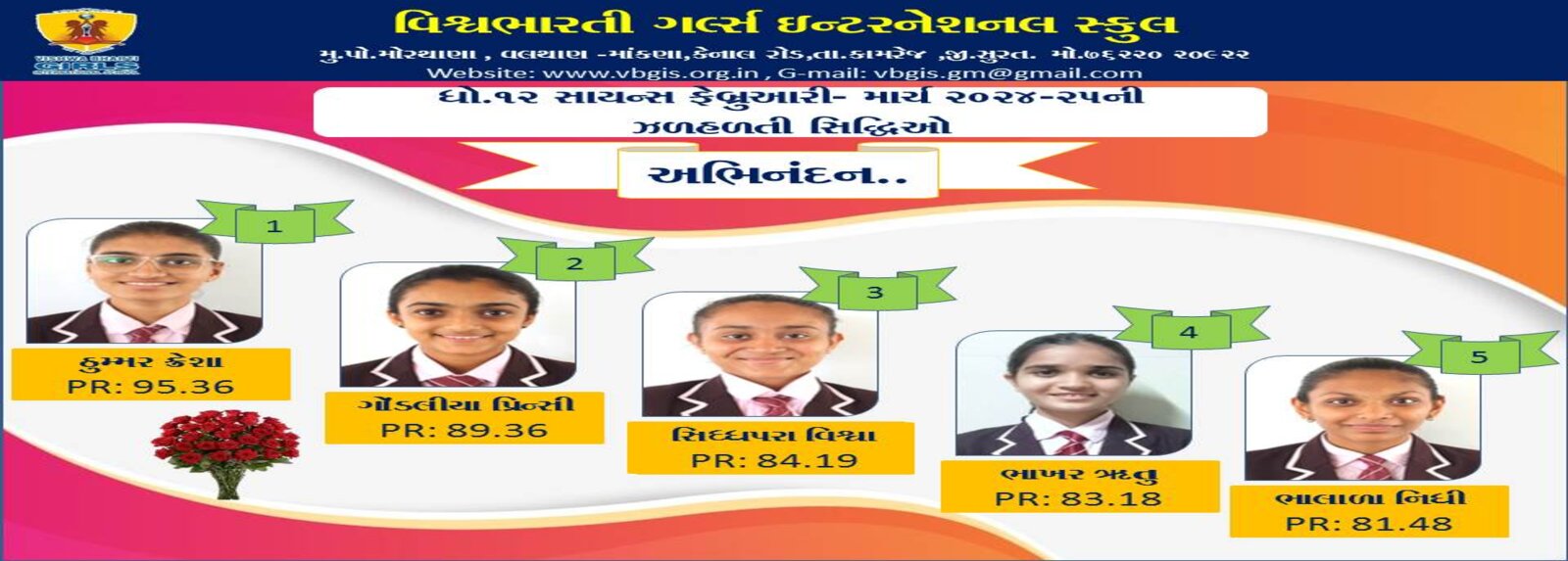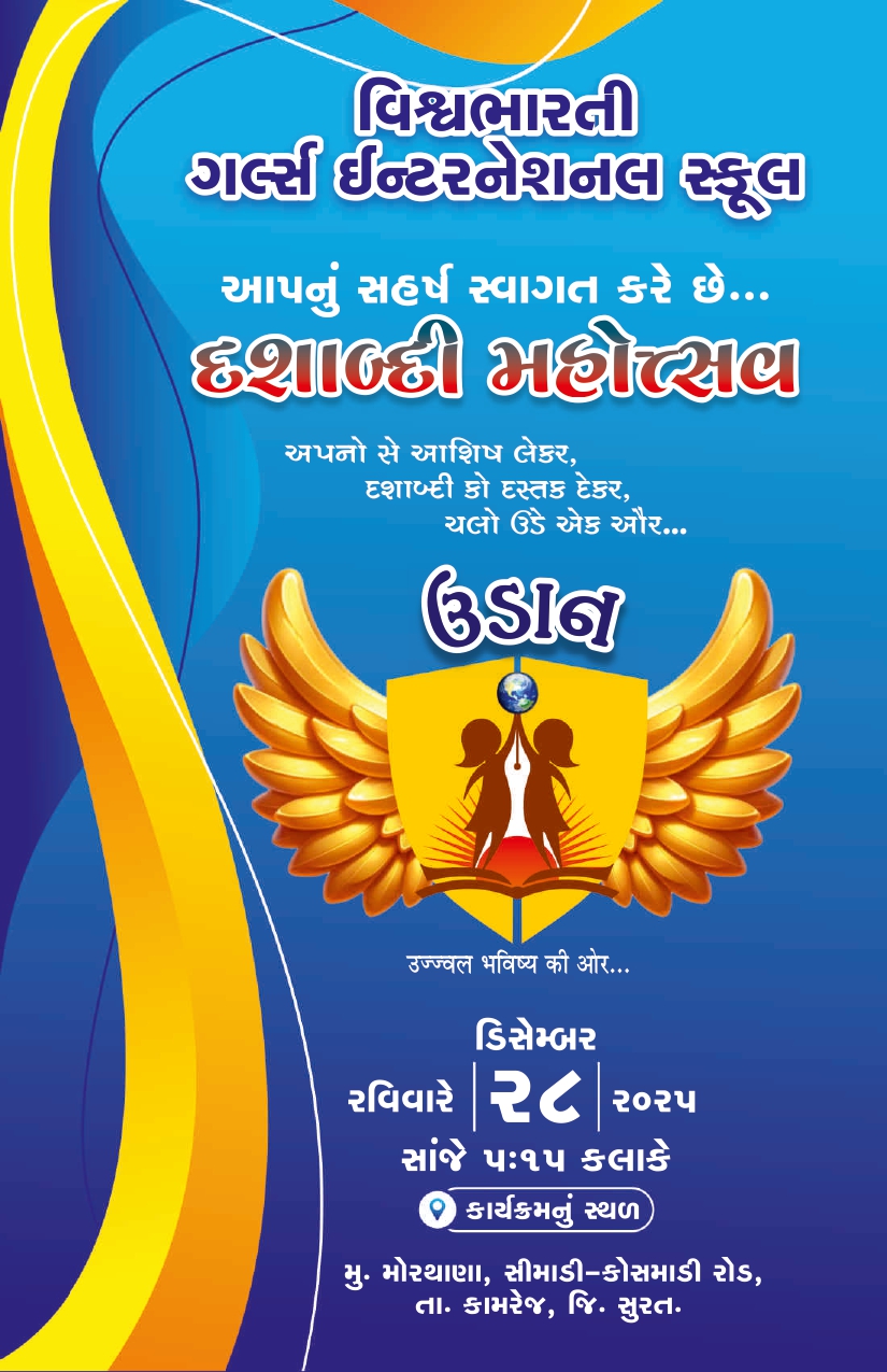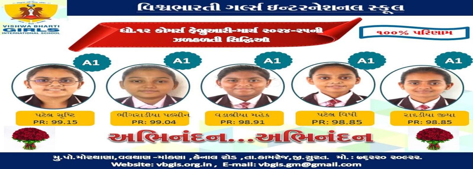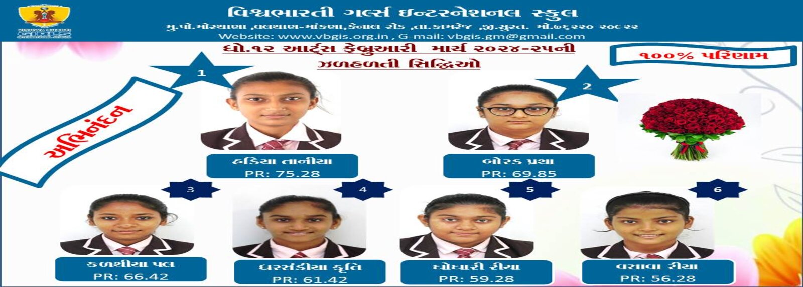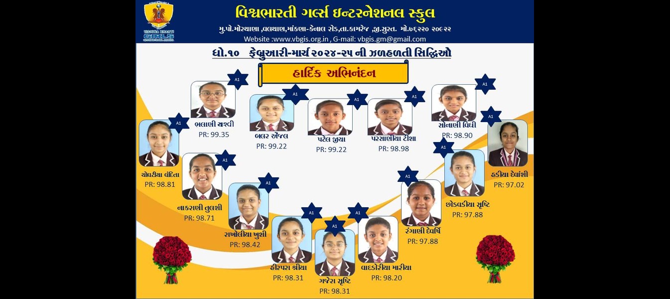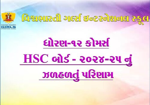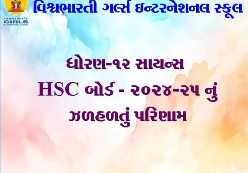 ગુજરાત બોર્ડમાં ધોરણ -૧૦ અને ૧૨ ૨૦૨૪-૨૫ માં ૧૦૦% પરિણામ ધરાવતી તેમજ સલામતી અને સંસ્કાર સાથે શિક્ષણ આપતી એકમાત્ર દીકરીઓની શાળા વિશ્વભારતી ગર્લ્સ ઈંટરનેશનલ સ્કુલ તમામ વાલીઓને અને દીકરીઓને તેમના શ્રેષ્ઠ પરિણામ માટે હાર્દિક અભિનંદન પાઠવે છે.