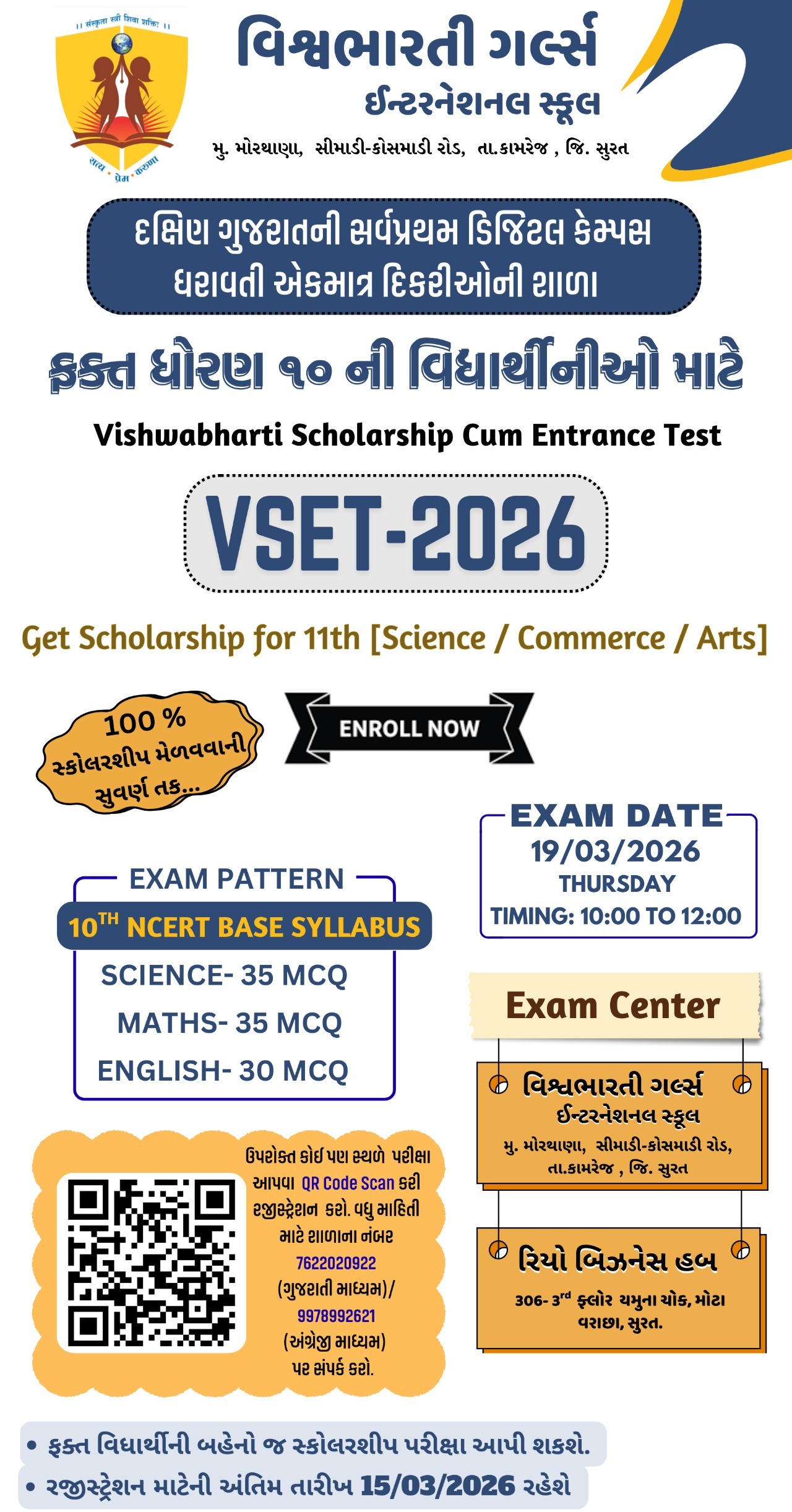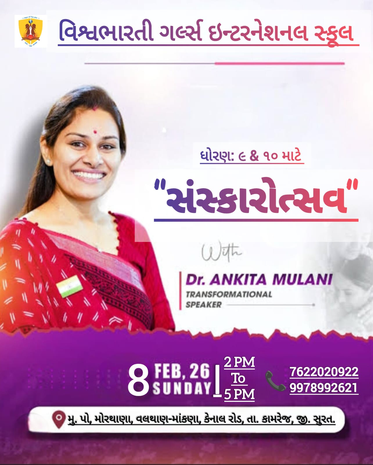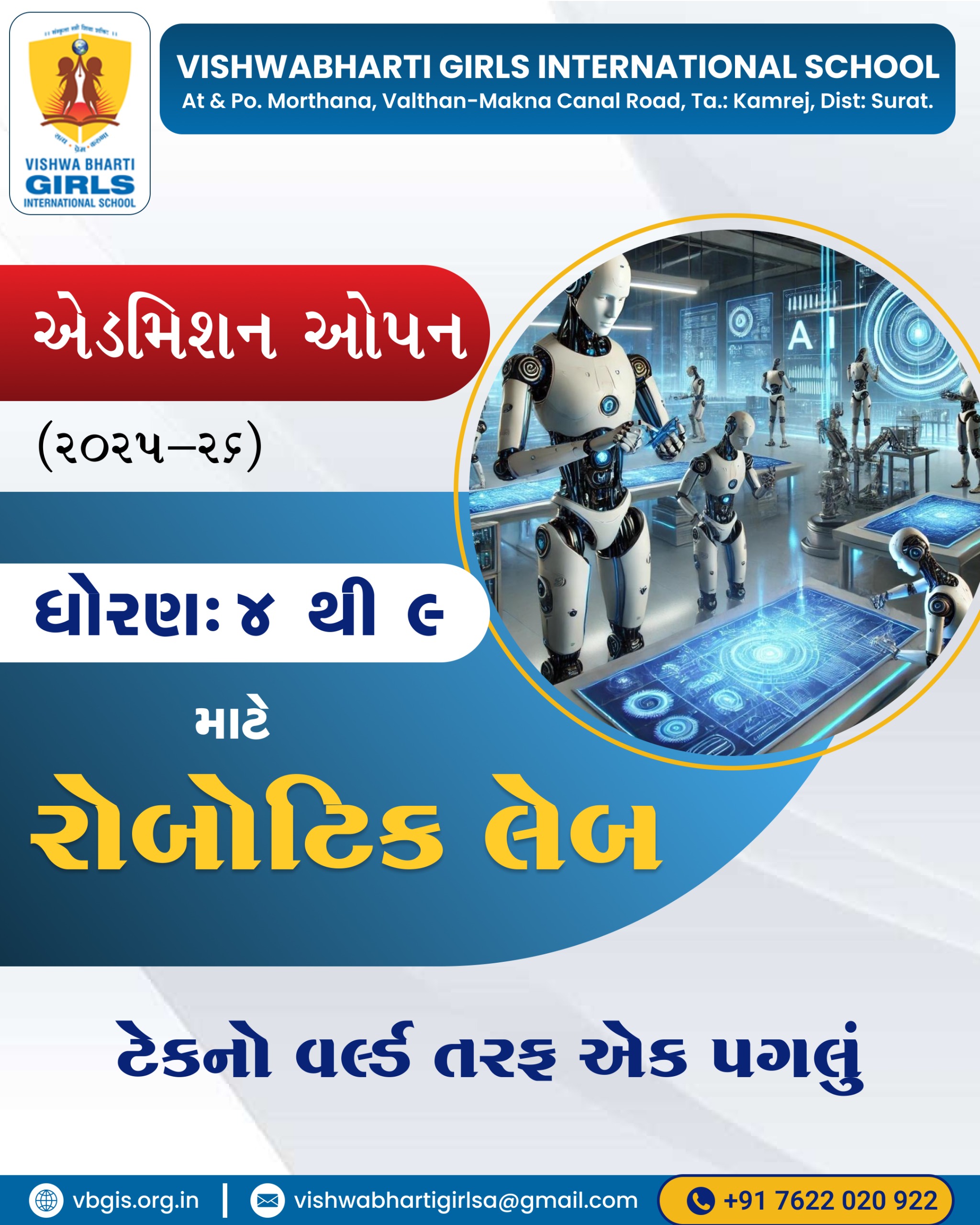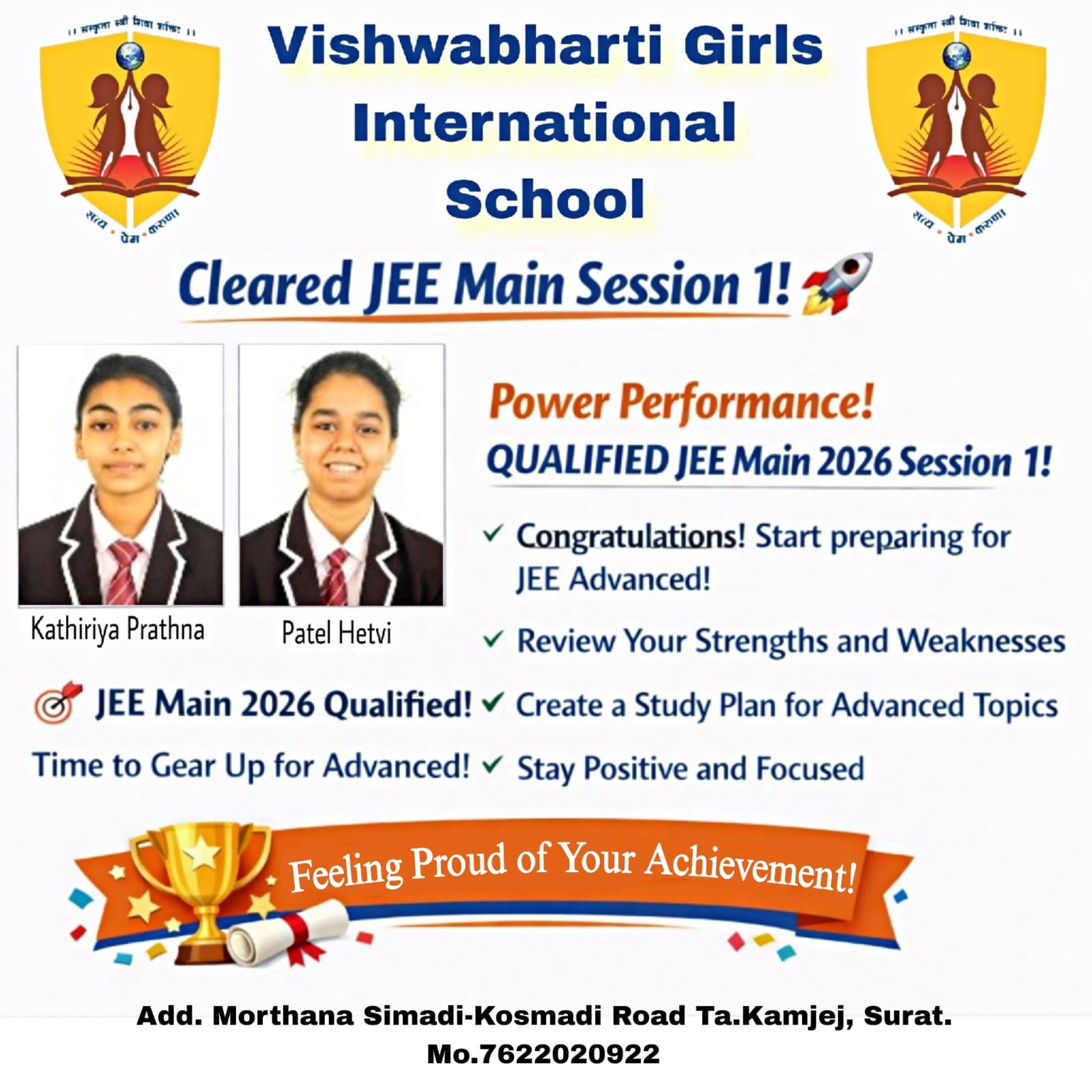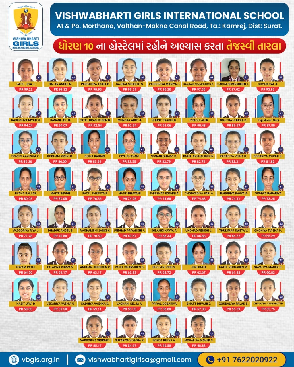 ગુજરાત બોર્ડમાં ધોરણ -૧૦ અને ૧૨ ૨૦૨૪-૨૫ માં ૧૦૦% પરિણામ ધરાવતી તેમજ સલામતી અને સંસ્કાર સાથે શિક્ષણ આપતી એકમાત્ર દીકરીઓની શાળા વિશ્વભારતી ગર્લ્સ ઈંટરનેશનલ સ્કુલ તમામ વાલીઓને અને દીકરીઓને તેમના શ્રેષ્ઠ પરિણામ માટે હાર્દિક અભિનંદન પાઠવે છે.