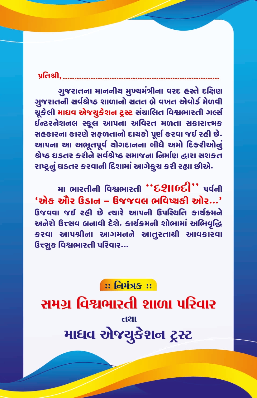 પ્રાચીન કાળથી દિવ્ય અને ભવ્ય ગણાતી ભારતીય સંસ્કૃતિના યસકલગી સમાન ગુજરાતમાં અનમોલ રતન જડાયું છે. માધવ એજ્યુકેશન ટ્રસ્ટ સંચાલિત, ભારતની સર્વપ્રથમ સંપૂર્ણ ડિજિટલ કેમ્પસ ધરાવતી, માત્ર દીકરીઓ માટેની શાળા -” વિશ્વભારતી ગર્લ્સ ઇન્ટરનેશનલ સ્કૂલ” આજે માત્ર સુરતમાં જ નહીં બલ્કે સમગ્ર ગુજરાતમાં ચર્ચાનો વિષય બનવા પામી છે.